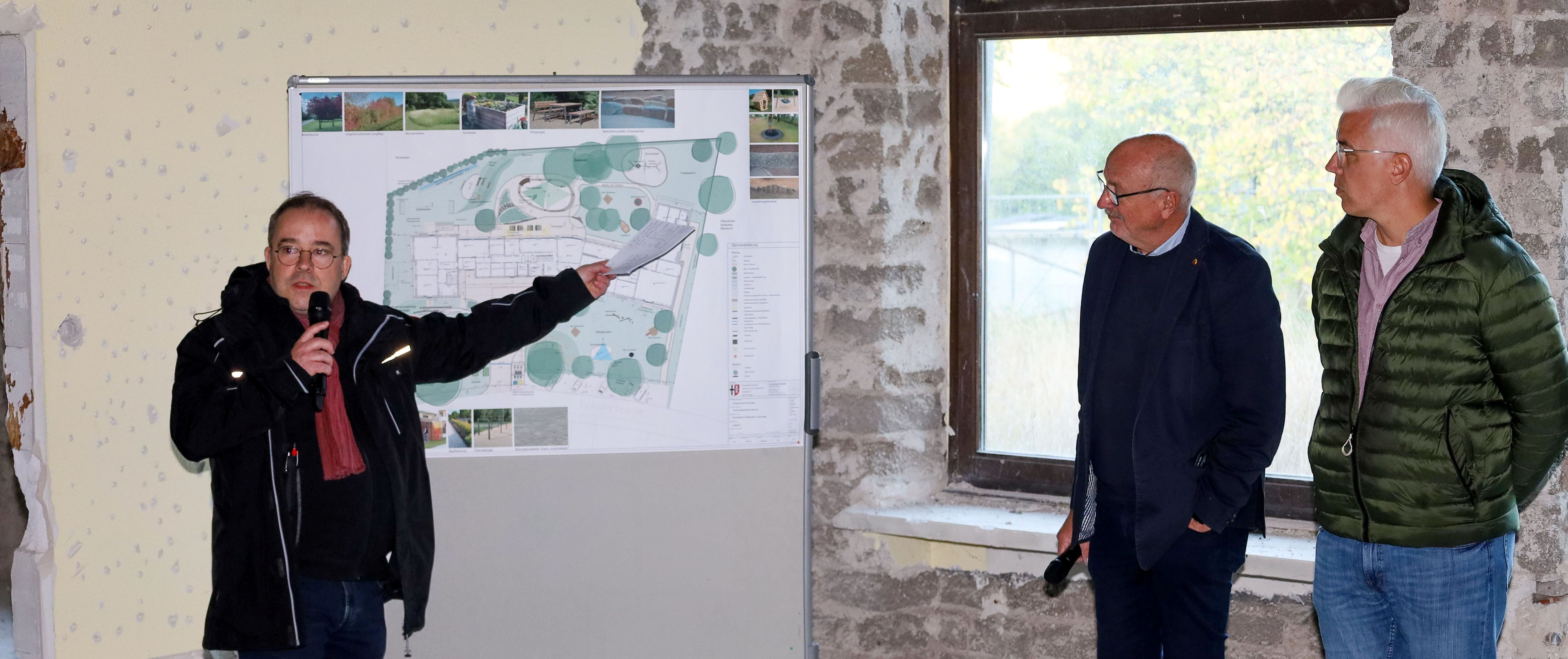 Die erste Führung startete um 16:00 Uhr im Ortsteil Liers, wo sich die Teilnehmenden an der Baustelle für die neue Tagespflege einfanden. Hier wird der Zweckverband Sozialstation Adenau-Altenahr ab 2026 eine Einrichtung mit 16 Plätzen betreiben. Der Bau ist bereits weit fortgeschritten – aktuell laufen die Arbeiten zum Innenausbau. Anschließend ging es weiter zum zukünftigen Gemeindehaus von Liers, das auf einem neuen Grundstück außerhalb der Überschwemmungszone entsteht. Derzeit wird der Abbruch des Bestandsgebäudes ausgeschrieben – ab 2027 soll hier ein sozialer Mittelpunkt für den Ortsteil beheimatet sein. Schließlich informierte die Gruppe sich auch über den Stand beim entstehenden Kalten Nahwärmenetz in Liers. Dabei wird Erdwärme für eine innovative, nachhaltige Wärmeversorgung genutzt. Die Bauleistungen werden im Dezember vergeben. Nach Fertigstellung im Jahr 2026 soll das Nahwärmenetz durch eine Bürgerenergiegenossenschaft betrieben werden.
